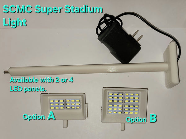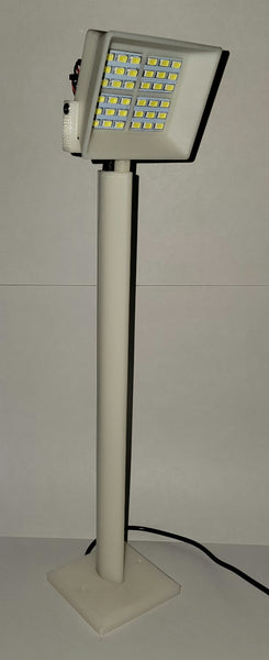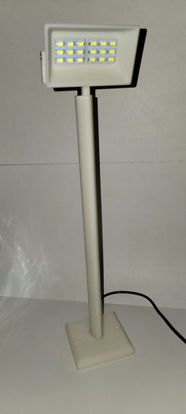 The Super Stadium Light is 3D Printed in GREY, as we have done with our popular light tower products, and can be painted or wrapped in stickers. The lights are tilt-adjustable up and down. A 12v power supply, and extension cable is included with each light kit.